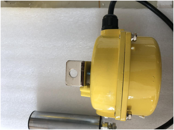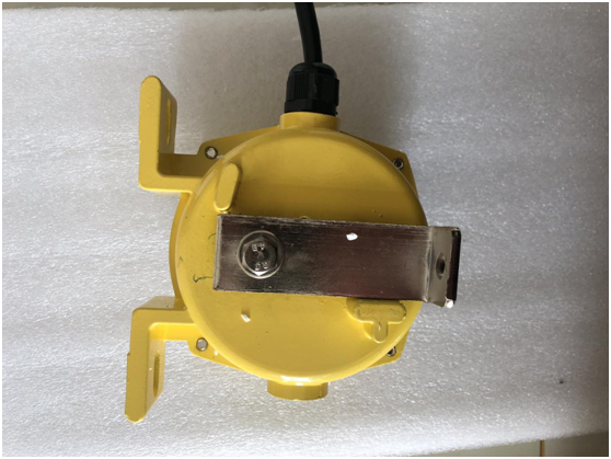 當運行中的膠帶發生跑偏現象時,膠帶邊緣帶動立棍旋轉并擠壓使之傾斜,若立棍傾斜角度大于一級動作角度時,開關發出一組開關信號,如立棍繼續傾斜大于二級動作角度時則輸出另一組開關信號。兩組開關信號可分別用于告警或停機,膠帶機復位正常運行后,立棍自動復位。