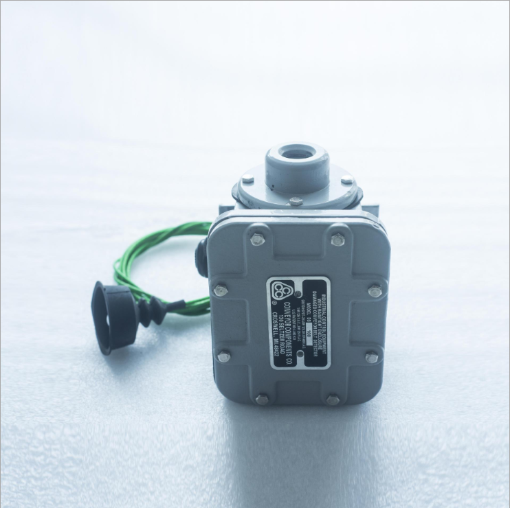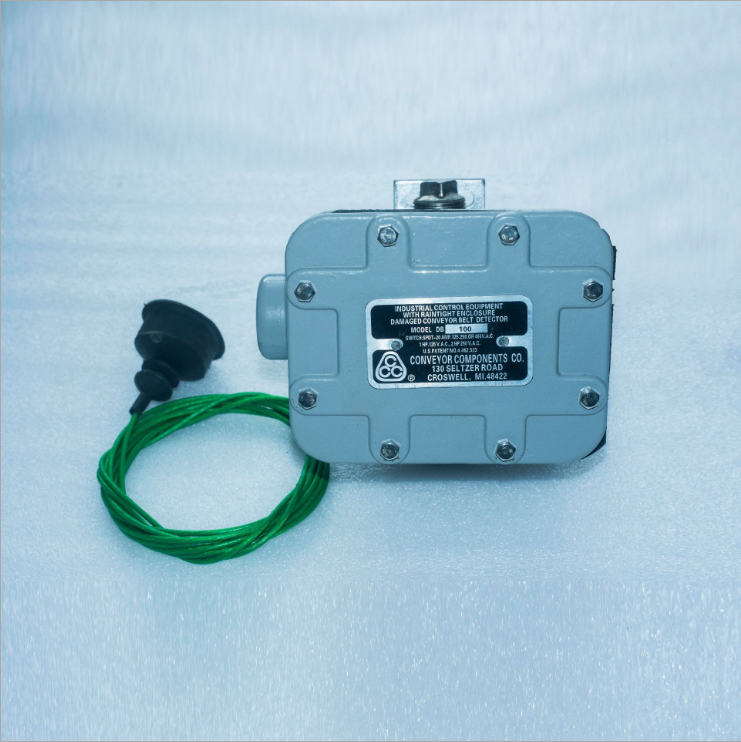 DB-100,TM-SLK-2D型撕裂開關在皮帶出現撕裂,戳破,鉸接處損壞或銳利物凸出皮帶時,能給監視人員提供報警信號或關掉輸送機。